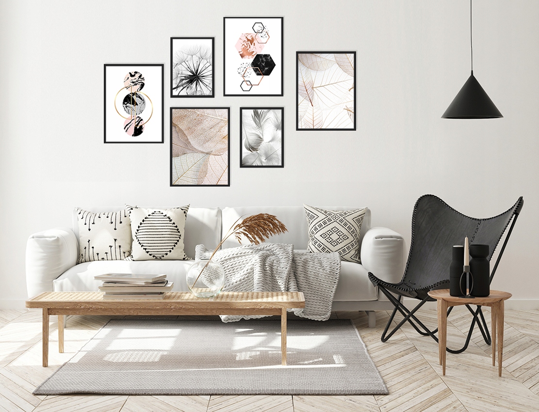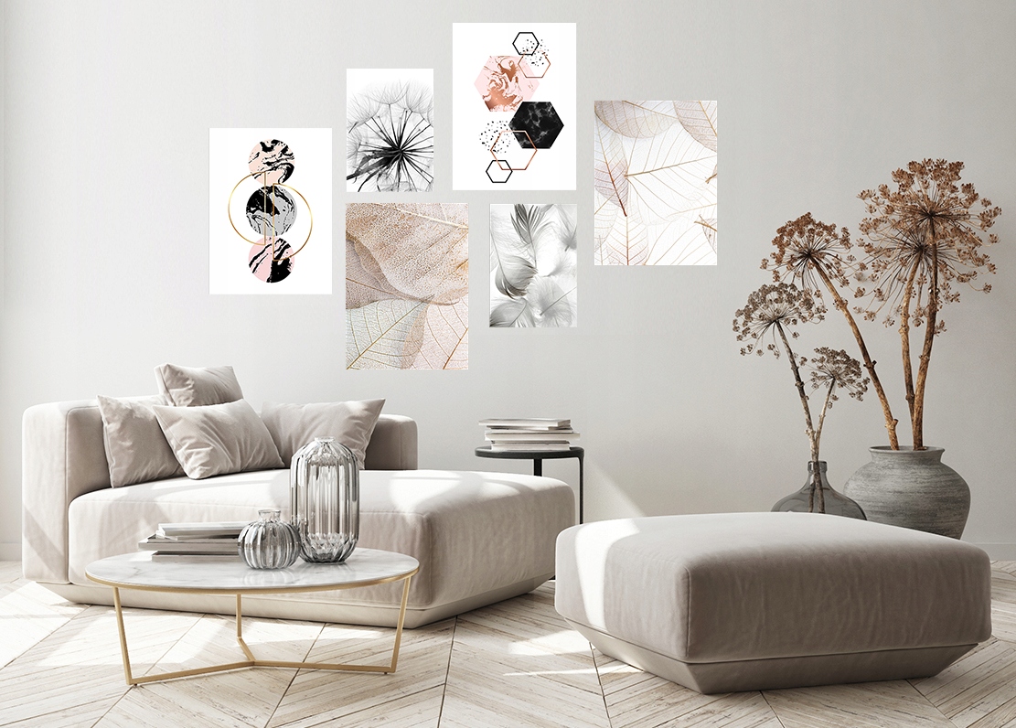 KOMPLET Galeria 6szt Plakaty BEZ RAMY KPMA 389 Oferujemy Państwu wyjątkową propozycję: KOMPLET 6 sztuk obrazów BEZ RAM.  Jest to komplet plakatów bez ramek, który został idealnie skomponowany pod względem graficznym, kolorystycznym i rozmiarami – tak, aby doskonale prezentował się na ścianie, jako galeria.  Aukcja dotyczy 6 sztuk plakatów bez ram, w następujących rozmiarach: 4x obraz 30×40 cm / druk na papierze foto2x obraz 21×30 cm / druk na papierze fotoJeśli nie lubisz tracić czasu na żmudnym przeglądaniu tysiąca wzorów, a następnie zastanawiać się, czy wybrane plakaty będą do siebie pasować, to nasza propozycja jest właśnie dla Ciebie! Nasi graficy poświęcieli czas, abyś Ty go nie musiał już tracić. 🙂 Wybraliśmy dla Państwa najlepsze wzory obrazów i skomponowaliśmy z nich kilkadziesiąt kompletów, z których każdy znajdzie coś dla siebie. Urządzasz mieszkanie/dom w stylu glamour, skandynawskim, nowoczesnym, art deco lub industrialnym? U nas znajdziesz propozycje do każdego wnętrza! Grafiki zostały wybrane przez naszych specjalistów, aby pomoć Państwu w stworzeniu spójnego wystroju. Obrazy można powiesic tak, jak na proponowanej przez nas kompozycji, lub też rozwiesić je na ścianach według własnego uznania. Dzięki nam, udekorujesz swoje wnętrza szybko, tanio i gustownie!Jeśli jednak wolisz samodzielnie skomponować własny zestaw plaktów, z innych grafik na naszych aukcjach – również istnieje taka możliwość. Wystarczy podać nam w wiadomości do Sprzedającego numery wzorów, a my skompletujemy Twoją niepowtarzalną kolekcję! Wybierz plakaty według wlasnego uznania z innych naszych aukcji i prześlij nam ich numery.  Możesz również przysłać nam do wydruku swoje zdjęcia np. z rodzinnego albumu.Dlaczego warto nam zaufać? Wszystkie plakaty powstają bezpośrednio po zamówieniu w naszej siedzibie i są drukowane na naszym parku maszynowym. Projekty plakatów powstają w naszym studiu graficznym, dzięki czemu oferujemy Państwu namodniejsze wzory zgodne z aktualnymi trendami wnętrzarskimi. Katalog naszej oferty plakatowej, sukcesywnie uzupełniany jest o nowe projekty. Nasi graficy trzymaja ręke na pulsie zmian i wiedzą co jest modne!Jakość i doświadczenie Bazując na wieloletnim doświadczeniu w obsłudze zarówno firm, jak i klientów indywidualnych wiemy, że dla naszych Klientów liczy się jakość produktów i szybkość obsługi – i właśnie to Państwu zapewniamy. Wiemy również, że przesyłki w rękach kurierów nie zawsze są traktowane „jak należy”, dlatego też szczególną uwagę zwracamy na solidne pakowanie towarów. Nasza ekipa, podczas produkcji i przygotowania zamówionego przez Was produktu, na wszystkich etapach dba o każdy szczegół. Dla nas najważniejsza jest jakość i zadowalenie Klientów.Zapraszamy również na inne nasze aukcje! – Sprawdź opinie wystawione przez naszych klientów i przekonaj się o naszej rzetelności.