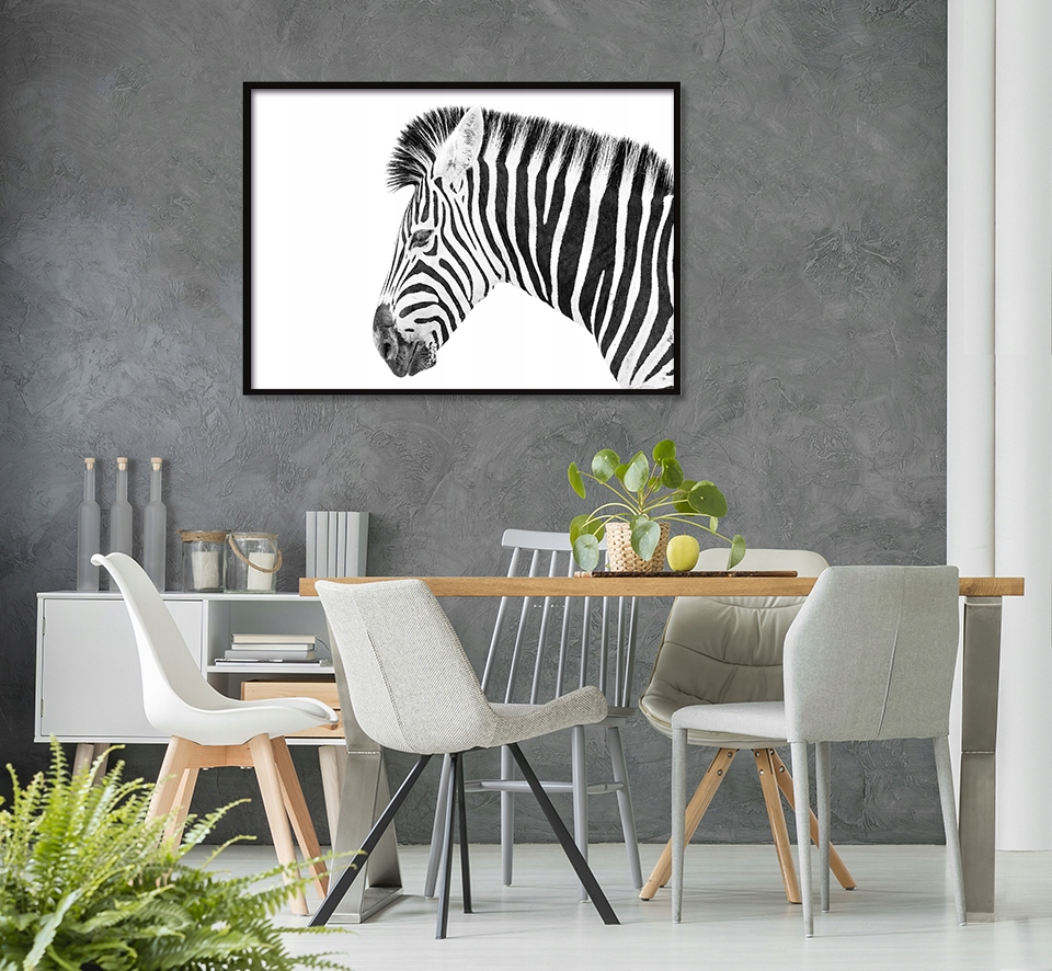 OBRAZ PLAKAT W RAMIE 43×33 cm Zebra Poziom P885Oferujemy Państwu nowoczesne plakaty-obrazy w ramach, stworzone w naszym studiu graficznym i wydrukowane na wysokiej jakości papierze foto. Nasze obrazy, to kompletny produkt, gotowy do zawieszenia na ścianie! Obraz zawiera: plakat High Resolution – cyfrowy druk wysokiej jakościramę drewnianą – jest lekka, a zarazem trwała i ponadczasowapleksi przeźroczyste o grubości 1 mm – bezpieczne (nie tłukące się, jak np. szkło), lekkie i estetyczne zabezpieczenie obrazuplecki – doskonałe usztywnieniemetalową zawieszkę umocowaną z tyłumetalowe blaszki, przymocowane do ramy Uwaga: Plakaty oprawiamy w czarne ramki. Na życzenie Klienta istnieje możliwość zmiany koloru ramki na inny, z naszej oferty.SPECYFIKACJA Obrazy drukujemy na wysokiej jakości papierze plakatowym: DRUK: cyfrowy, wysokiej rozdzielczościPAPIER: fotograficzny, gramatura 250 gWYMIARY plakatu: 30×40 cmWYMIARY z ramką: 33×43 cmNasze obrazy można łączyć z pozostałymi obrazami i plaktami z naszej oferty, tworząc własne, indywidualne zestawy. Obrazy są produkowane i dostarczane do Państwa, bezpośrednio z naszej siedziby w Polsce.