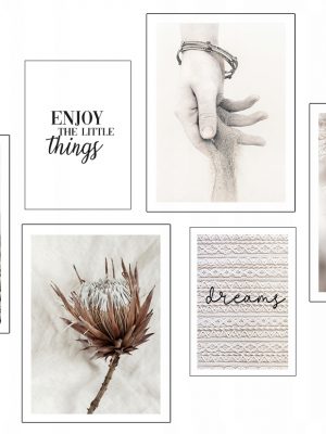 KOMPLET Galeria 6szt Plakaty BEZ RAMY KPMA 382 Oferujemy Państwu wyjątkową propozycję: KOMPLET 6 sztuk obrazów BEZ RAM. Jest to komplet plakatów bez ramek, który został idealnie skomponowany pod względem graficznym, kolorystycznym i rozmiarami – tak, aby doskonale prezentował się na ścianie, jako galeria. Aukcja dotyczy 6 sztuk plakatów bez ram, w następujących rozmiarach: 4x obraz 30×40…